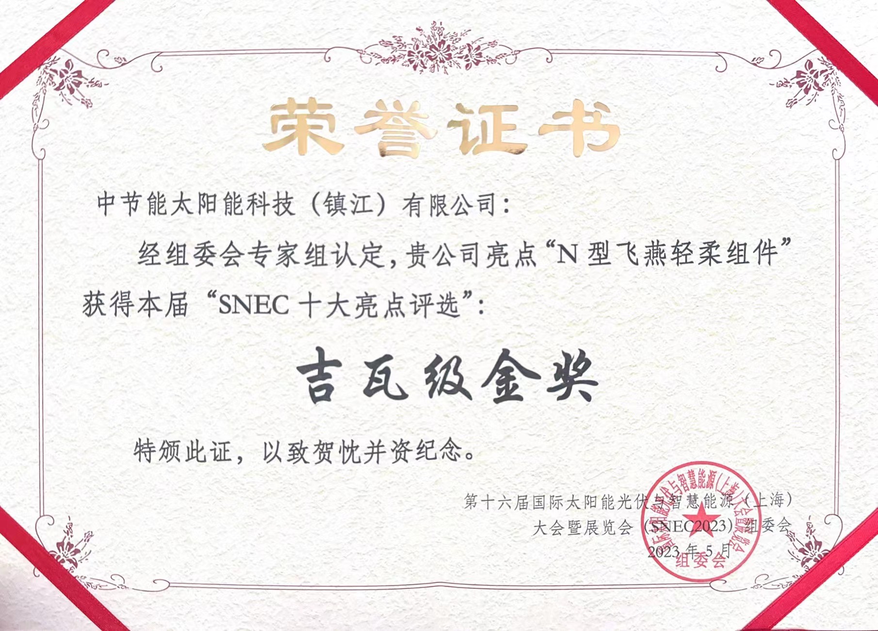“N 型飛燕輕柔組件”吉瓦級金獎