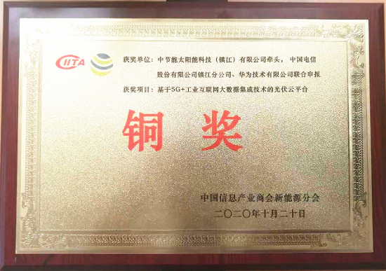 ????? 近日,首屆信息產(chǎn)業(yè)兼容系統(tǒng)創(chuàng)新應(yīng)用大賽新能源專項(xiàng)賽頒獎典禮在河南鞏義隆重舉行,由中節(jié)能太陽能科技(鎮(zhèn)江)有限公司牽頭、中國電信股份有限公司鎮(zhèn)江分公司、華為技術(shù)有限公司聯(lián)合申報(bào)的《基于5G+工業(yè)互聯(lián)網(wǎng)大數(shù)據(jù)集成技術(shù)的光伏云平臺》項(xiàng)目榮獲銅獎。