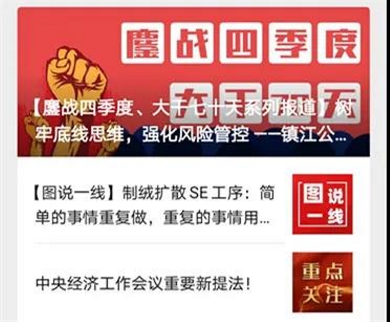 ????? 唱響主旋律,傳播正能量。四季度黨群文化部利用微信公眾號(hào)宣傳載體發(fā)稿約60余篇,重點(diǎn)策劃“鏖戰(zhàn)四季度、大干七十天系列報(bào)道”15篇、“圖說一線系列報(bào)道”12篇,展現(xiàn)各個(gè)部門、各個(gè)工序四季度大干、苦干的精神面貌,營造濃厚的宣傳氛圍;不斷創(chuàng)新宣傳方式,打好宣傳組合拳,在做好微信公眾號(hào)、官網(wǎng)、OA傳統(tǒng)宣傳媒介的基礎(chǔ)上,通過開通視頻號(hào)、抖音號(hào),擴(kuò)大公司知名度和品牌影響力。