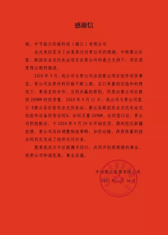 ? ? ? ?在信中,中核紫云能源有限公司充分肯定了鎮(zhèn)江公司在合作中,秉承“客戶第一”的原則,克服新冠疫情及原材料價(jià)格上漲等種種困難,積極協(xié)調(diào)、加價(jià)運(yùn)輸,保質(zhì)保量完成組件交付任務(wù),確保項(xiàng)目順利推進(jìn)的努力與成效。 ? ? ? 急客戶之所急,想客戶之所想。一直以來(lái),鎮(zhèn)江公司堅(jiān)持用心服務(wù),始終將客戶需求放在第一位,千方百計(jì)解決客戶困難,用專業(yè)服務(wù)精神為客戶創(chuàng)造價(jià)值。 每一句感謝的話 以客戶為中心