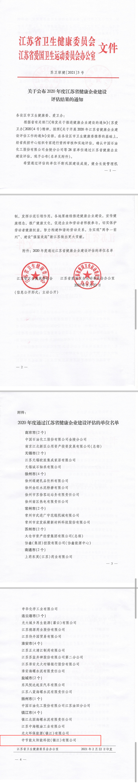 ? ? ? ?2月22日,江蘇省衛(wèi)生健康委員會(huì)和江蘇省愛(ài)國(guó)衛(wèi)生運(yùn)動(dòng)委員會(huì)辦公室公布了2020年江蘇省健康企業(yè)建設(shè)評(píng)估結(jié)果,鎮(zhèn)江公司成功上榜!此次“健康企業(yè)”的創(chuàng)建,充分體現(xiàn)了鎮(zhèn)江公司的職業(yè)健康管理水平。
