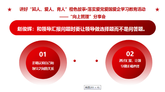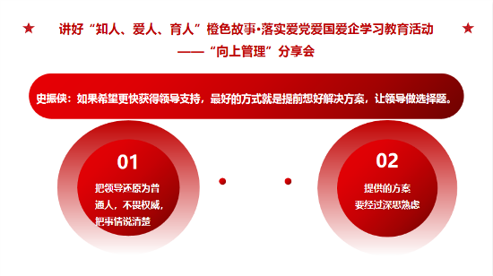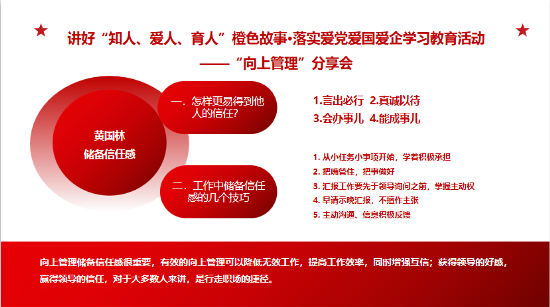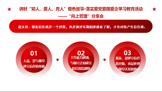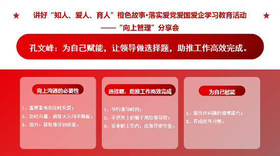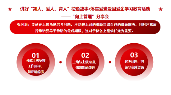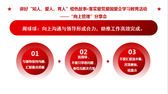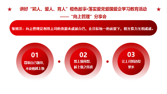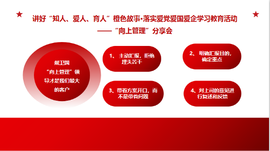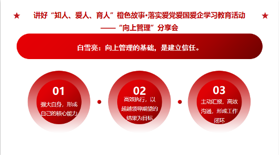 愛 黨 愛 國 愛 企 ? 我 們 在 行 動 ? ? 5月30日至31日,鎮(zhèn)江公司第二期【成長課堂】圍繞“向上管理”主題,開展了團隊共同成長的系列分享會,積極打造具有發(fā)展力的學(xué)習(xí)組織,提升團隊執(zhí)行力與解決問題的能力,汲取愛黨愛國愛企新能量。 ? ? ? ? 01 產(chǎn)品研發(fā)部 白雪亮 ?