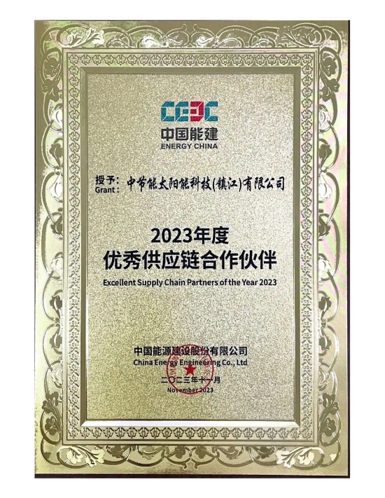 ??? 中國能建集團(tuán)是一家中國乃至全球能源電力、基礎(chǔ)設(shè)施等行業(yè)提供系統(tǒng)性、一體化、全周期、一攬子發(fā)展方案和服務(wù)的綜合性特大型集團(tuán)公司,業(yè)務(wù)遍布世界140多個國家和地區(qū)。此次獲得優(yōu)秀供應(yīng)鏈合作伙伴資格,標(biāo)志著鎮(zhèn)江公司生產(chǎn)和服務(wù)能力均滿足工業(yè)領(lǐng)域的相關(guān)要求,是中國能建集團(tuán)對鎮(zhèn)江公司在精益管理、體系運(yùn)行、技術(shù)能力、質(zhì)量保證等方面的充分認(rèn)可。本次優(yōu)秀供應(yīng)鏈合作伙伴的榮譽(yù)更加堅定了鎮(zhèn)江公司持續(xù)提升產(chǎn)品性能和服務(wù)效率的信心和恒心,公司將持續(xù)協(xié)助中國能建集團(tuán)對光伏系統(tǒng)進(jìn)行優(yōu)化,降低電站投資成本,提升電站收益率,實(shí)現(xiàn)雙方合作共贏。