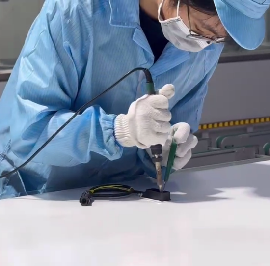 柔軟卻堅毅 這是一雙被笨重手套藏起來的秀氣的手,這也是一雙在鎮(zhèn)江公司光伏組件生產(chǎn)過程中至關(guān)重要的手,這雙手柔軟卻堅毅,這雙手把接線盒和匯流條焊接在一起,連接太陽能組件產(chǎn)生的電力與外部線路,確保每一瓦電力都能安全、高效地傳遞,牢固地守護著光伏組件電力輸送的重要一關(guān)。