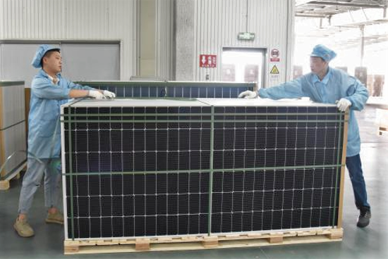 不易卻珍愛 這里是組件出廠的最后一關(guān),這里是與“山”搏斗的地方,光伏組件成品疊成“巨石”、堆成“大山”。他們卻視“巨石”如珍寶,為“巨石”罩上最后一層防護,確保組件在運輸過程中不受外部環(huán)境的影響。他們撫摸著每一塊組件,希望每一塊組件都平安抵達(dá),發(fā)揮它們的作用,為世界帶來綠色電力。